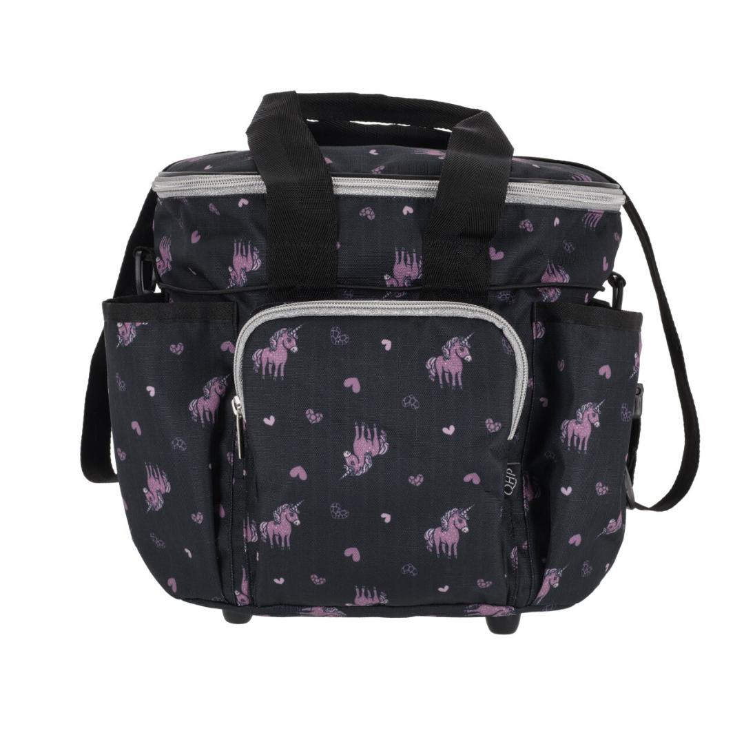 Sød strigletaske med fint unicorn motiver fra QHP. Tasken er med små rum udenpå, og et stort rum indeni. Den kan lukkes med lynlås i låget.