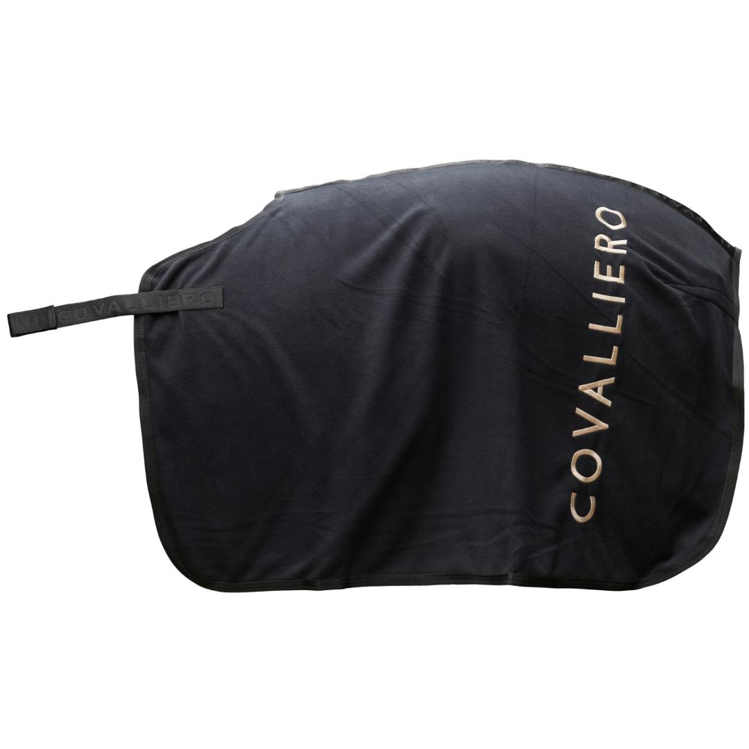 Lænde fleecetæppe fra Covalliero, med Covalliero skrevet ned af låret. Den sættes fast på sadlen med velcrostropper.