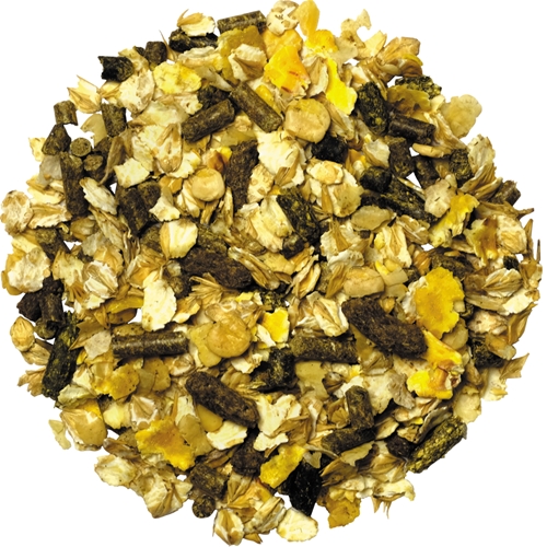 Bygflager, lucerne, hvedeklid, soja, Linamix®, majsflager, rapsskrå, hestebønneskaller, cornflakes, spelt, roefibre, puffede kerner, havreskaller, johannesbrød, rapsolie, isomaltulose (lavglykæmisk kulhydrat), sukkerrørmelasse, OS Complex, Digestive Support
