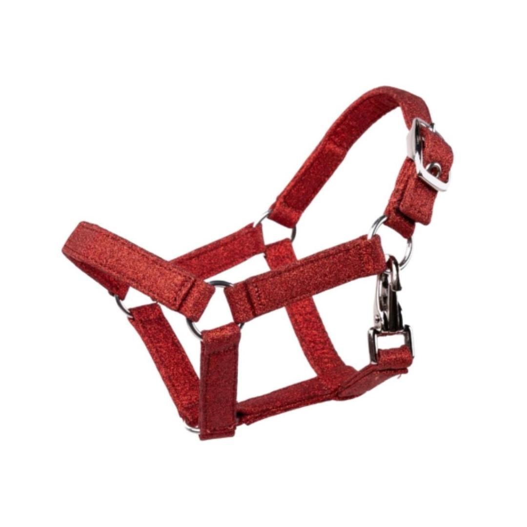 Lækker grime med glitter til Bella og Slim kæphestene. Den kan justeres over nakken. Fin jule grime i en fin rød farve med massere af glitter.