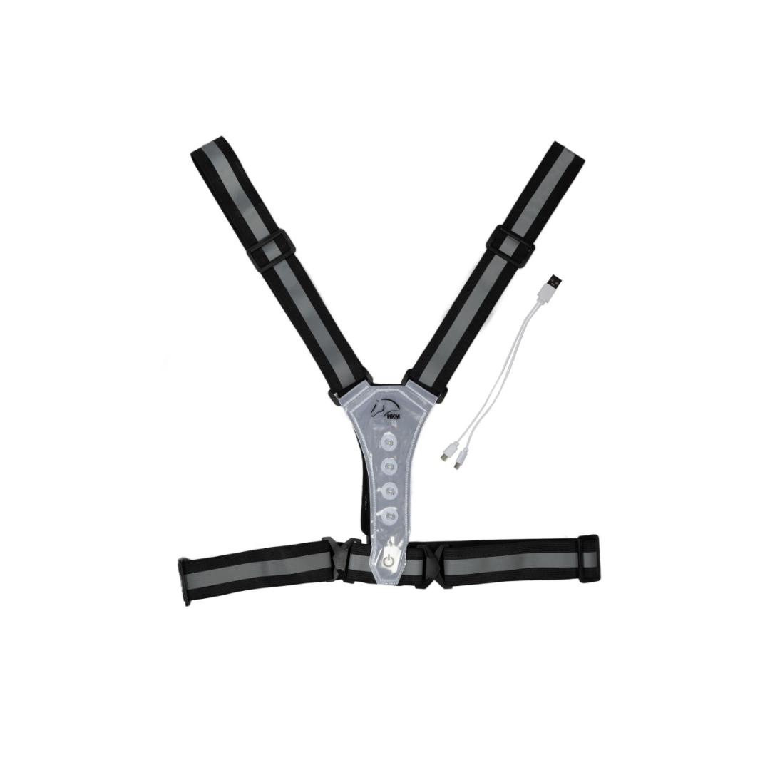 LED-vest fra HKM. DEn lyser med hvid foran og rød bagpå. Den har opladeligt batteri. DEn har elastik om livet og over skuldrene, som er justerbar.