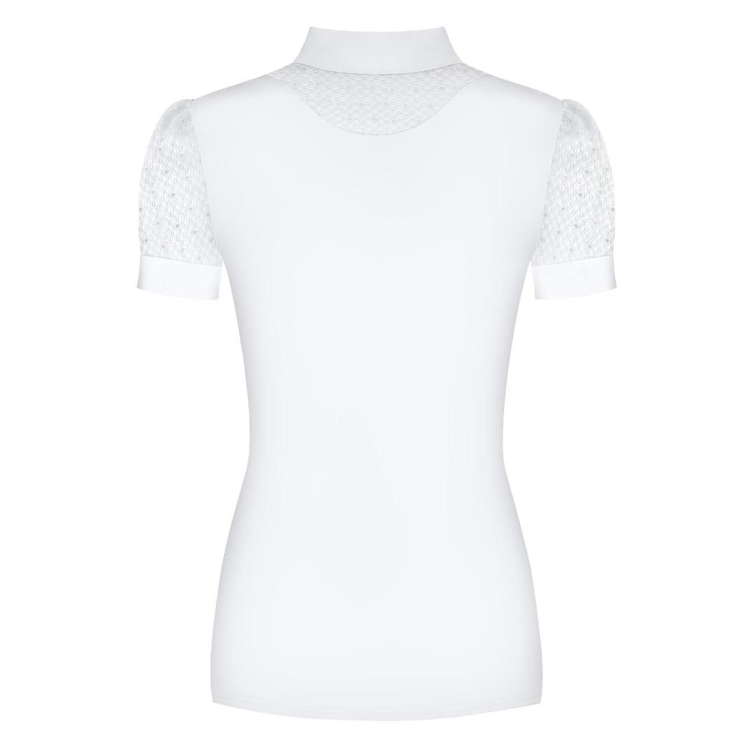 Elegant stævne t-shirt fra Fairplay. Den er med fine blonder på ærmerne, i nakken og foran ved halsen. Den har små fine sten rund på blonderne. Den har fine små klare sten på de 3 knapper ved halsen. Den er lavet i et lækkert blødt elastisk materiale.