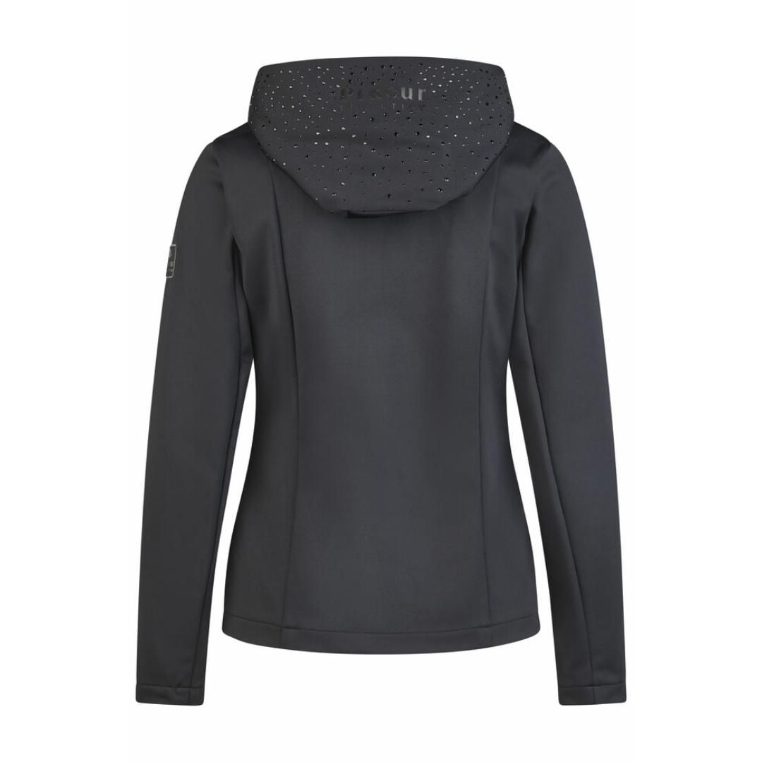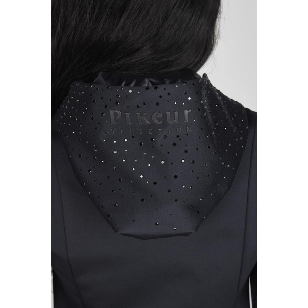 Lækker blød fleecejakke fra Pikeur. Jakken er lavet med lækker blød fleece på indersiden, og er glat og smudsafvisende på ydersiden. Den har Pikeur stående hen over hætten, og så en masse sorte sten. Hætten sættes fast med en magnet på ryggen, som gør den bliver på plads under rideturen.