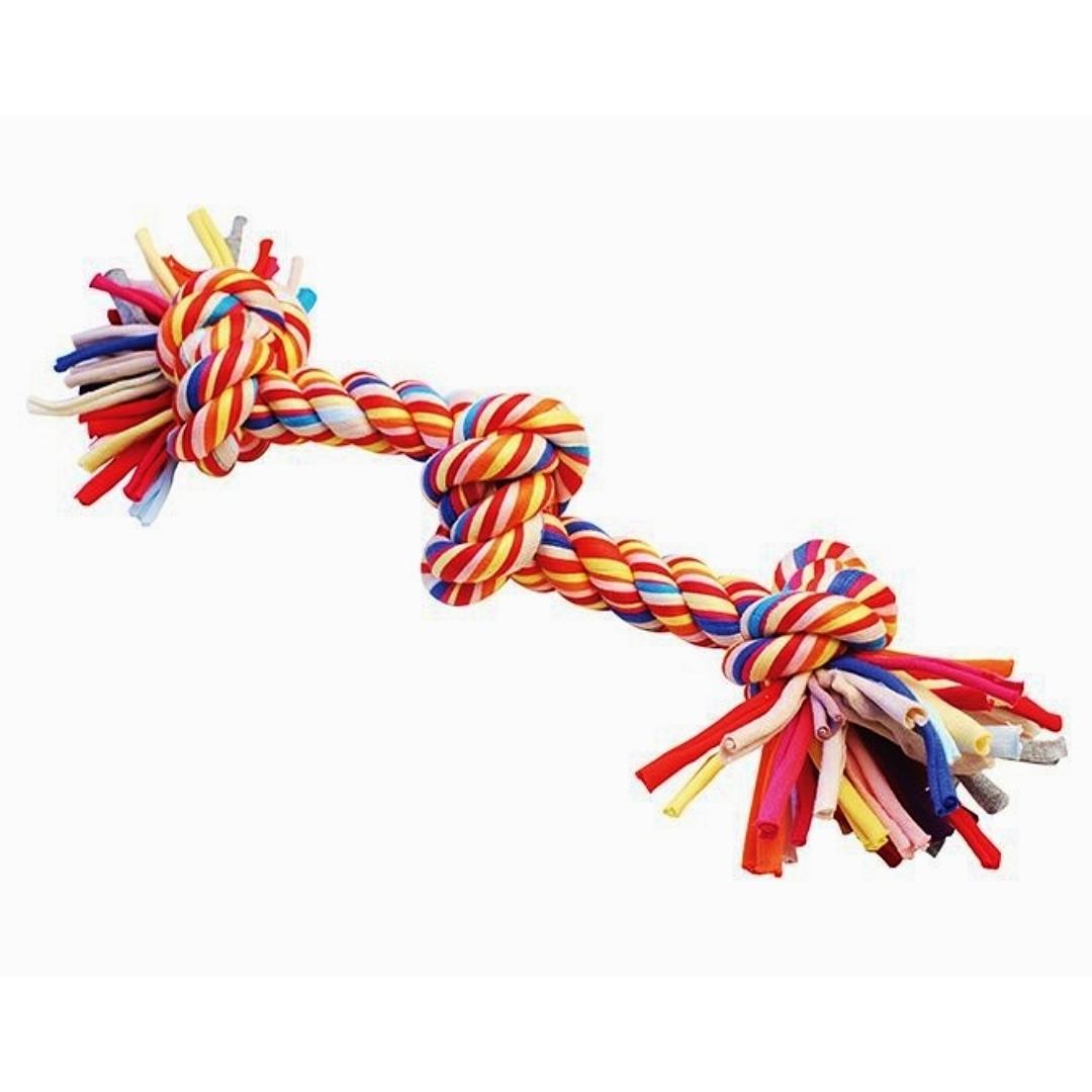 Herligt knudereb i muntre farver. Det holder til rigtig meget og trævler ikke så nemt, da det er fremstillet af strimler af genbrugte t-shirts. Her er til mange timers sjov leg.