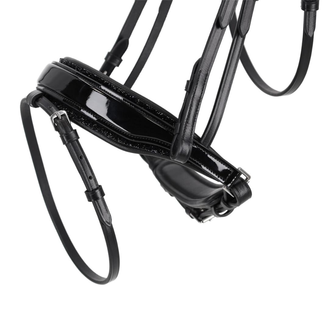 Den fineste anatomiske trense fra QHP med glimmer, bling og lak på pande- og næsebånd. Trensen er med tilbagetræk og lavet i lækkert blødt læder med bløde polstringer for at mindske trykket på hestens nakke og næseryg. Pandebåndet og pad'en på næsebåndet kan nemt udskiftes til blå eller sølv glimmer.