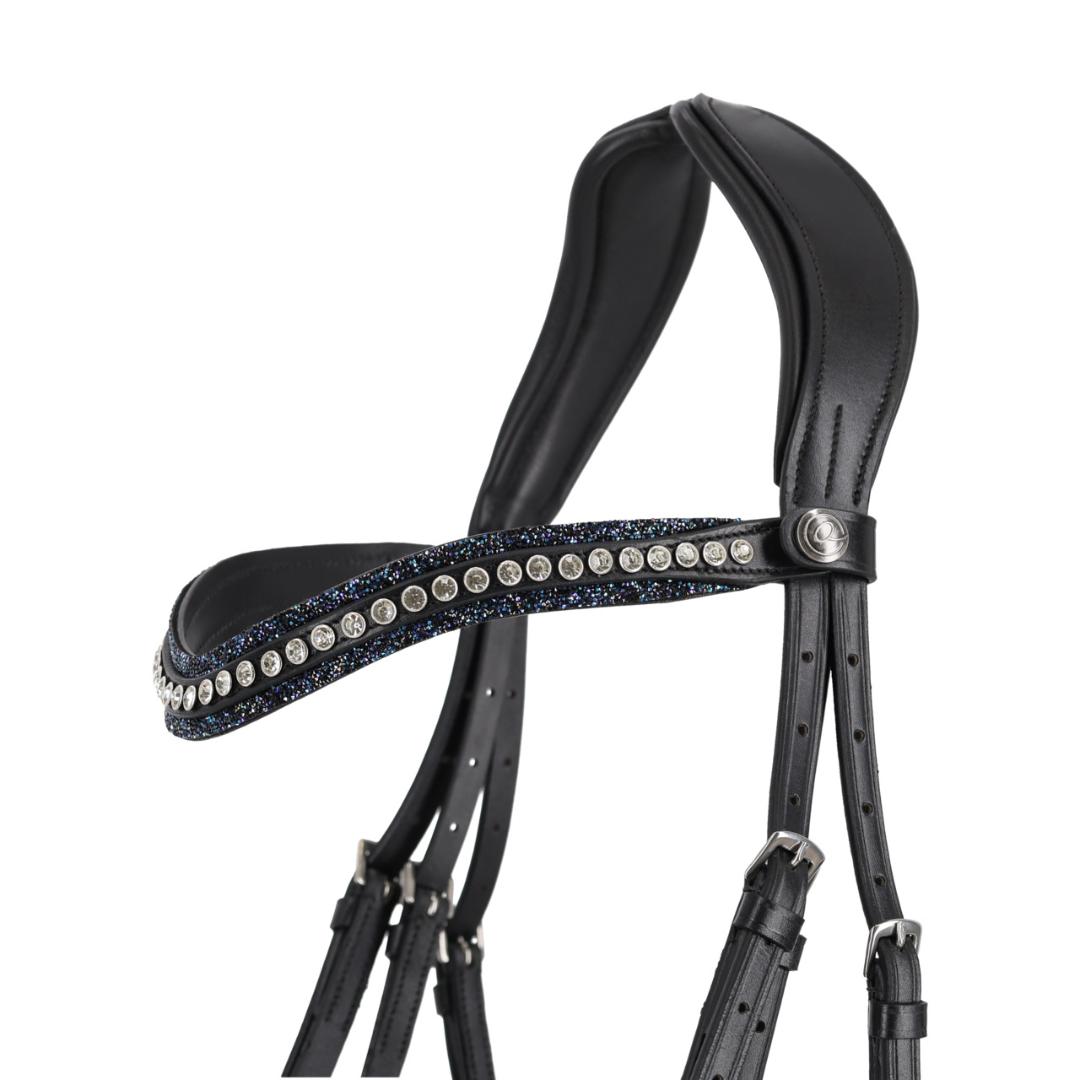 Elegant pandebånd i sort-navy glimmer med hvide sten, der passer til trensen Skye fra QHP. Det er meget nemt at udskifte med trykknappen. Passer sammen med den matchende pad til næsebåndet (S_9116ZWNA).