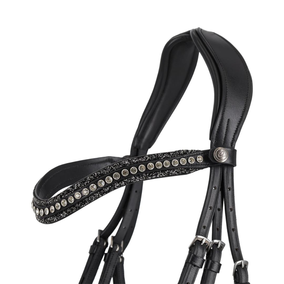 Elegant pandebånd i sort-sølv glimmer med hvide sten, der passer til trensen Skye fra QHP. Det er meget nemt at udskifte med trykknappen. Passer sammen med den matchende pad til næsebåndet (S_9116ZWZI).