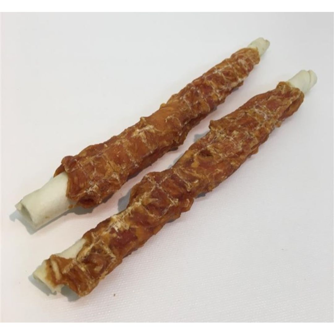 Lækre tyggepinde med tørret kylling omkring. Supergode som stimulerende belønning til hunden. De hjælper samtidig med at pleje hundens tænder og tandkød.